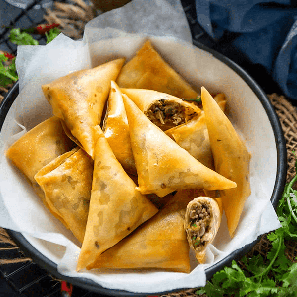 These are triangular pastries filled with spices and vegetables or chicken made from refined wheat flour.